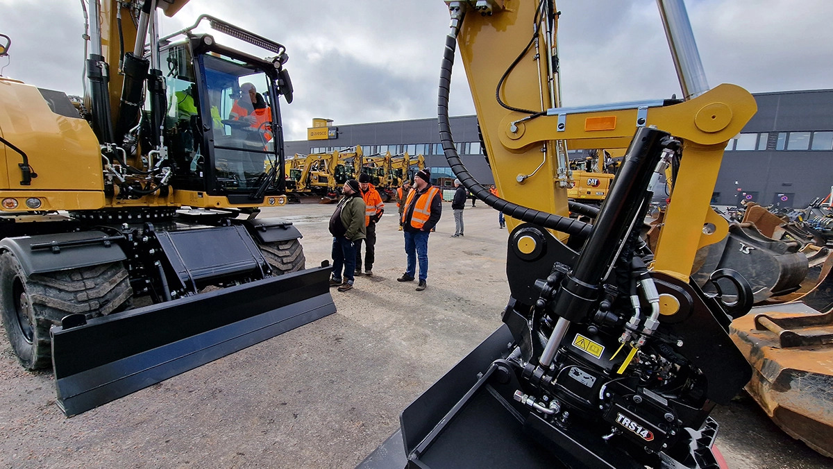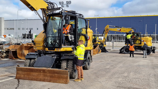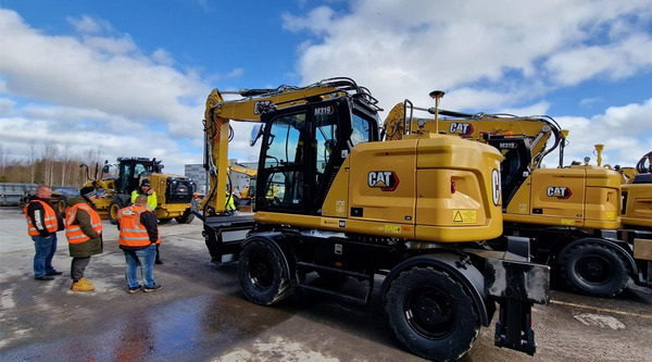 Lyhyen kierroksen jälkeen ryhmä siirtyi tutustumaan Caterpillarin NextGen-perheen pyöräalustaisiin kaivukoneisiin.