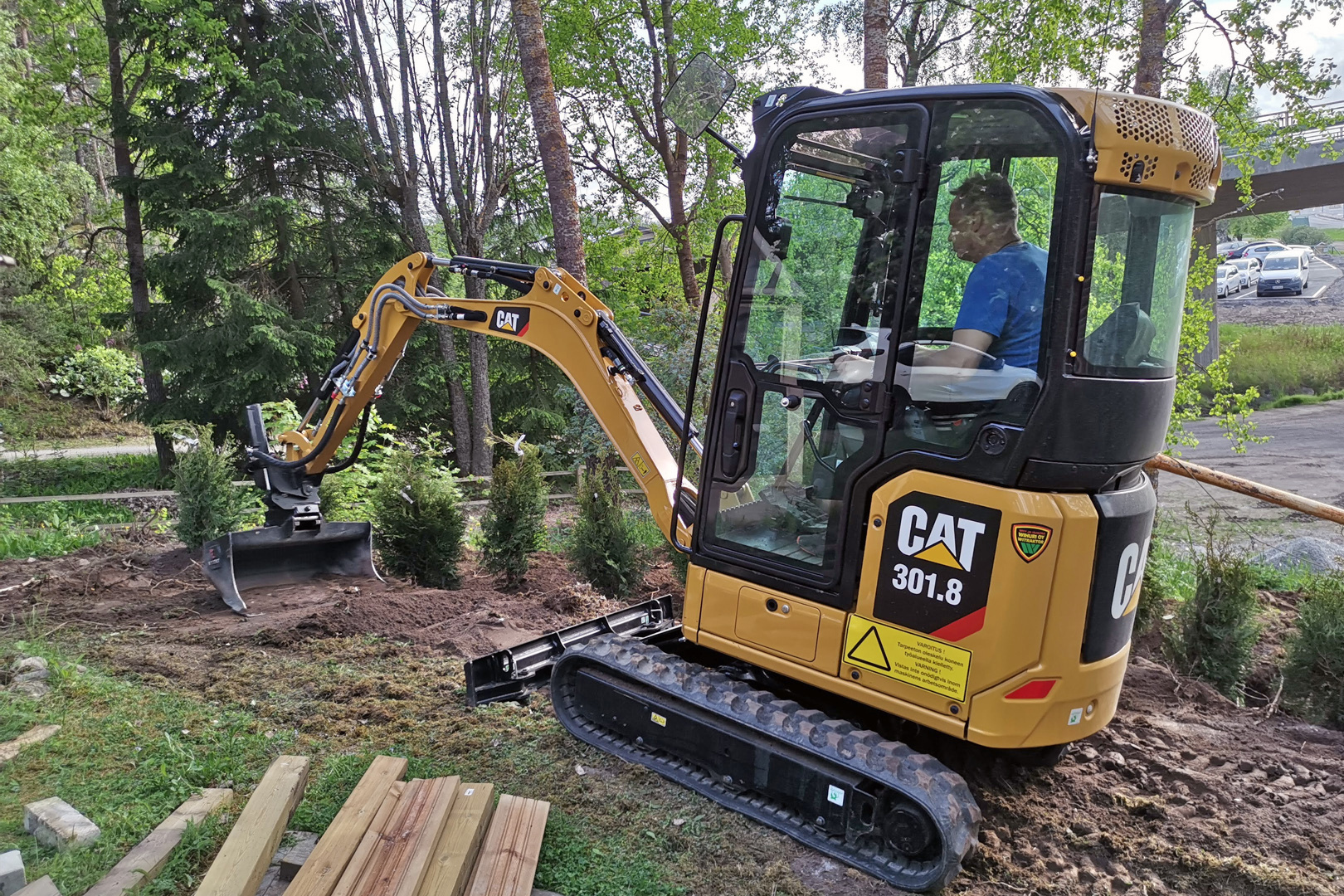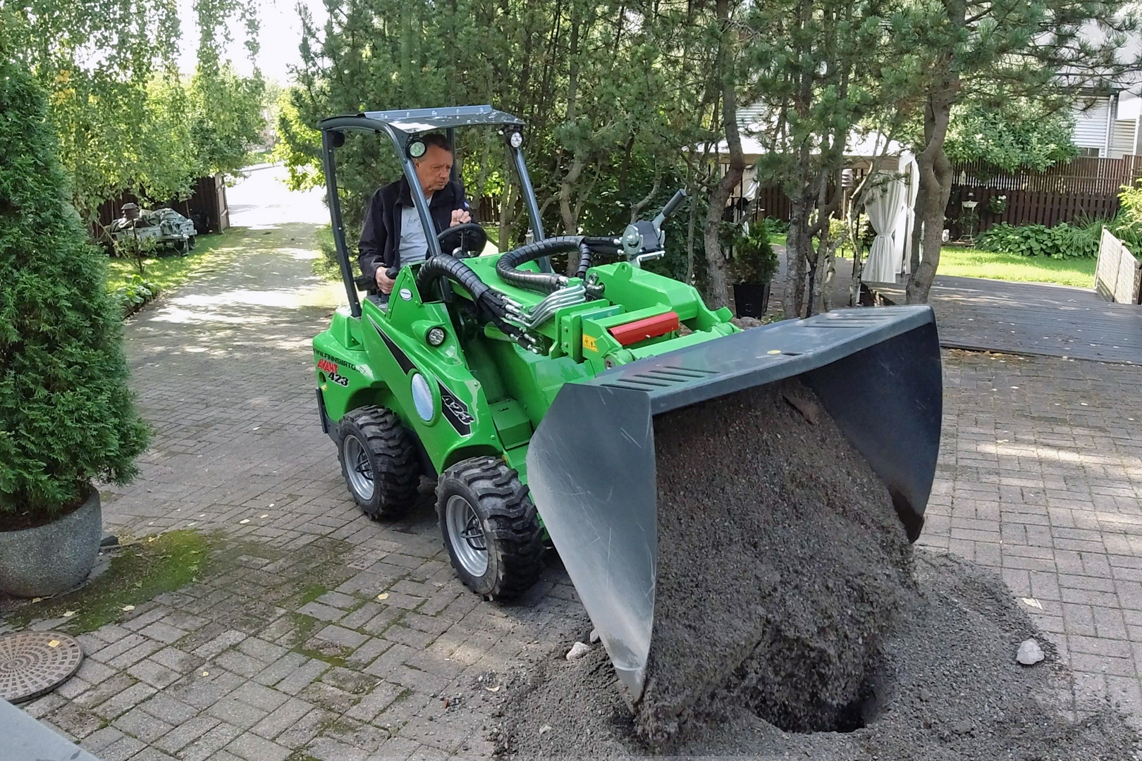 Mitoitus on siis tärkeää. Jos työ on pelkkää pintamaan tasoittelua ja matalien istutuskuoppien kaivelua, riittää 1–2 tonnin painoinen kaivukone siihen hyvin. Ne ovat kapeita, joten liikkuminen onnistuu ketterästi. Kun esimerkiksi sepeliä, multaa tai tiilinippuja pitää siirtää paikasta A paikkaan B, tarvitaan toisentyyppistä kalustoa. Pienet pyörä- ja pienkuormaajat kuten Avantit, Kramerit ja kaltaisensa soveltuvat tähän työhön mainiosti. Aisoihin saa kiinnitettyä erikokoisia kauhoja, trukkihaarukoita, harjalaitteita ym. ym.