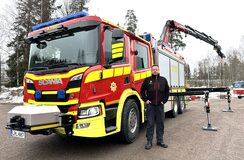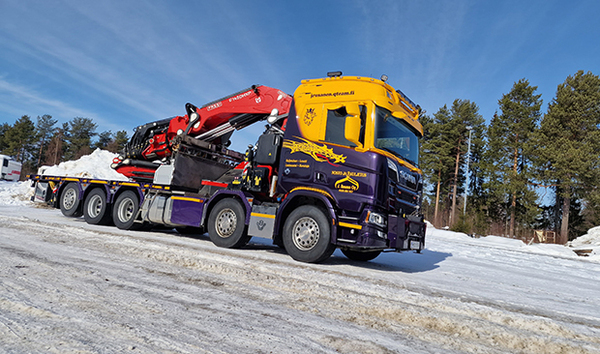 ”Niinhän se tahtoo olla, että nosturi on aina pikkasen pieni ja metrin lyhyt”, veistelee Jouko Rusanen kuvaillessaan tavanomaista perustetta, kun nykyisen nosturiauton vaihtamista suurempaan pohditaan. ”Vakavasti ottaen, meillä tärkeimmän asiakkaan, eli Terrafamen, tarpeet ohjasivat siihen, että nosturin kokoluokka oli tämä”, hän jatkaa. ”Yhä raskaampia nostoja tehdään sisätiloissa, ja siellä voimakas puominosturi on ainut vaihtoehto. Toisaalta lavalla tai perävaunussa saadaan tavaraakin jonkin verran mukaan.” Rusasen Scaniassa siltasäännön vähäisesti nipistämää kantavuutta on 5 700 kg omapainon ollessa 36 tonnia.
