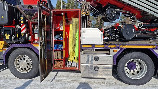 Tuorein lisäys nosturiautojen joukkoon on viisiakselinen Scania R590, johon valkealalainen Nappa-Machine Oy on asentanut Fassi 1450R-HXP TECHNO -nosturin, rakentanut lavan ja varustellut yksityiskohtia myöten toimivaksi työkaluksi.