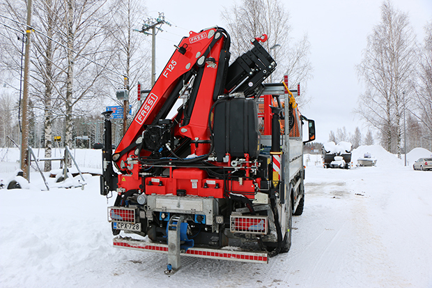”Aiemmin meillä oli käytössä takavetoinen auto, ja vaikka silläkin pääsi yllättävän hyvin, on tämä aivan toista maata”, Kähäri sanoo, ja jatkaa, että tiukan paikan tullen avuksi voi ottaa auton keulalla olevan vinssin. Vinssi saa käyttövoimansa nosturin hydrauliikasta, ja sitä ohjataan nosturin kauko-ohjaimella. ”Kävely- ja hiihtokilometrit vähenevät aikaisempaan verrattuna”, hän arvelee.
