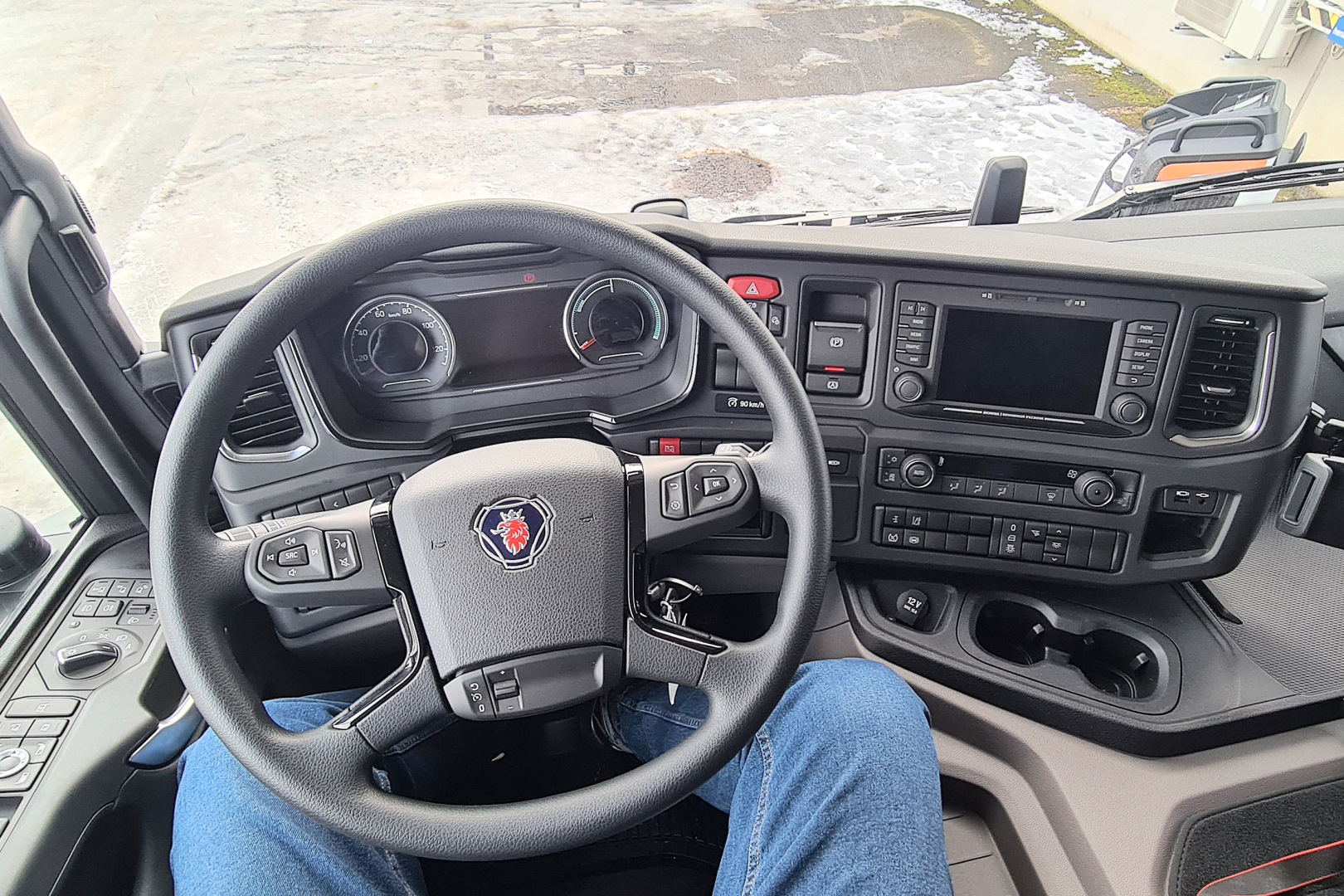 Hallintalaitteiltaan BEV-Scania on polttomoottoriveljiensä kaltainen. Kojelauta on lähestulkoon identtinen, vain mittariston toinen kiekko on erilainen. Kierroslukumittarin tilalla on nyt sähkön käytöstä ja latauksesta kertova viisarinäyttö. Auto käynnistetäänkin virta-avaimella perinteiseen tapaan. Jarrupoljin autosta löytyy, mutta sen käyttöä syytä välttää. Sähköajoneuvon oikeanlaiseen ajamiseen liittyy liike-energian hyödyntäminen hidastuksissa. Sitä varten ohjauspyörän oikealla puolella on viiksivipu, jolla säädellään moottorijarrutuksen ja samalla talteenoton tehoa. Vipua oikein käytettynä jää jarrupolkimen tarve vähäiseksi, joka tarkoittaa tervetullutta jarruremonttien vähenemistä. Ajosuunnan vaihtimen virkaa tekevä, kierrettävä kytkin on samaisessa vivussa.