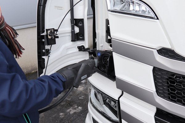 Scania on päätynyt latauksessa pelkkään tasavirtalataukseen. Autossa ei ole omaa laturia hidasta vaihtovirtalatausta varten. Poisjättämisen perustana lienee juuri tuo AC-latauksen hitaus. Suurikapasiteettisen litiumioniakun lataus veisi sillä menetelmällä niin paljon aikaa, että tehollinen ajoaika jäisi hyvin lyhyeksi. Ammattikäytöstä ei voitaisi tällöin puhua.