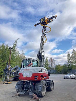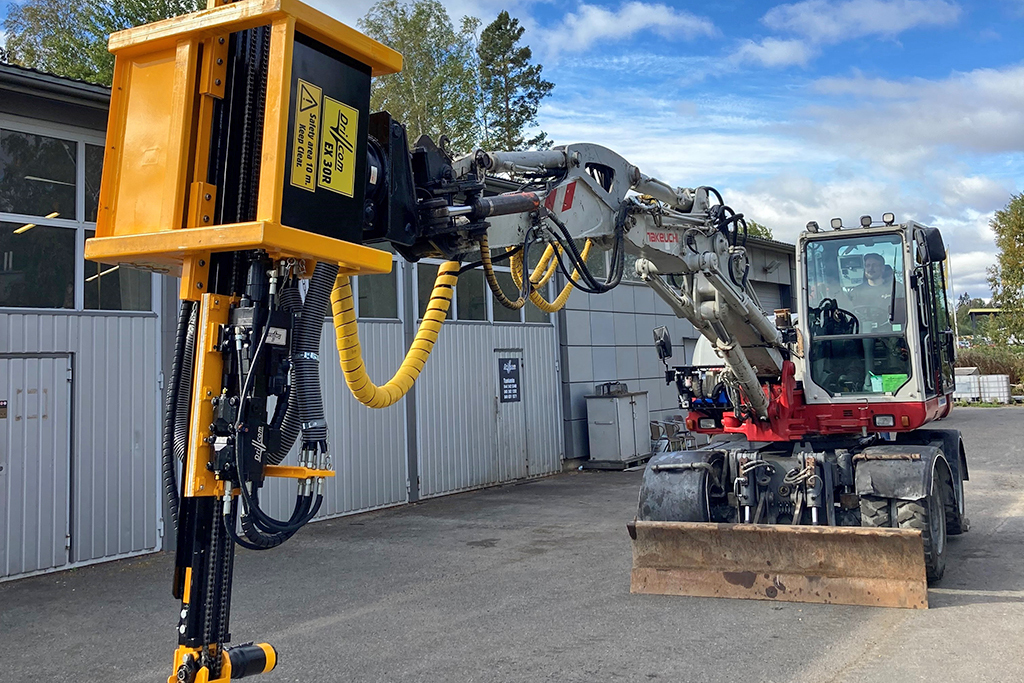 Takeuchi on hyvä peruskone myös poraukseen muun muassa riittävän hydrauliikan tuoton ansiosta. Lisäksi lähes 700 kilogrammaa painava poralaite vaatii peruskoneelta vakautta, joka Takeuchissa havaittiin myös riittäväksi.