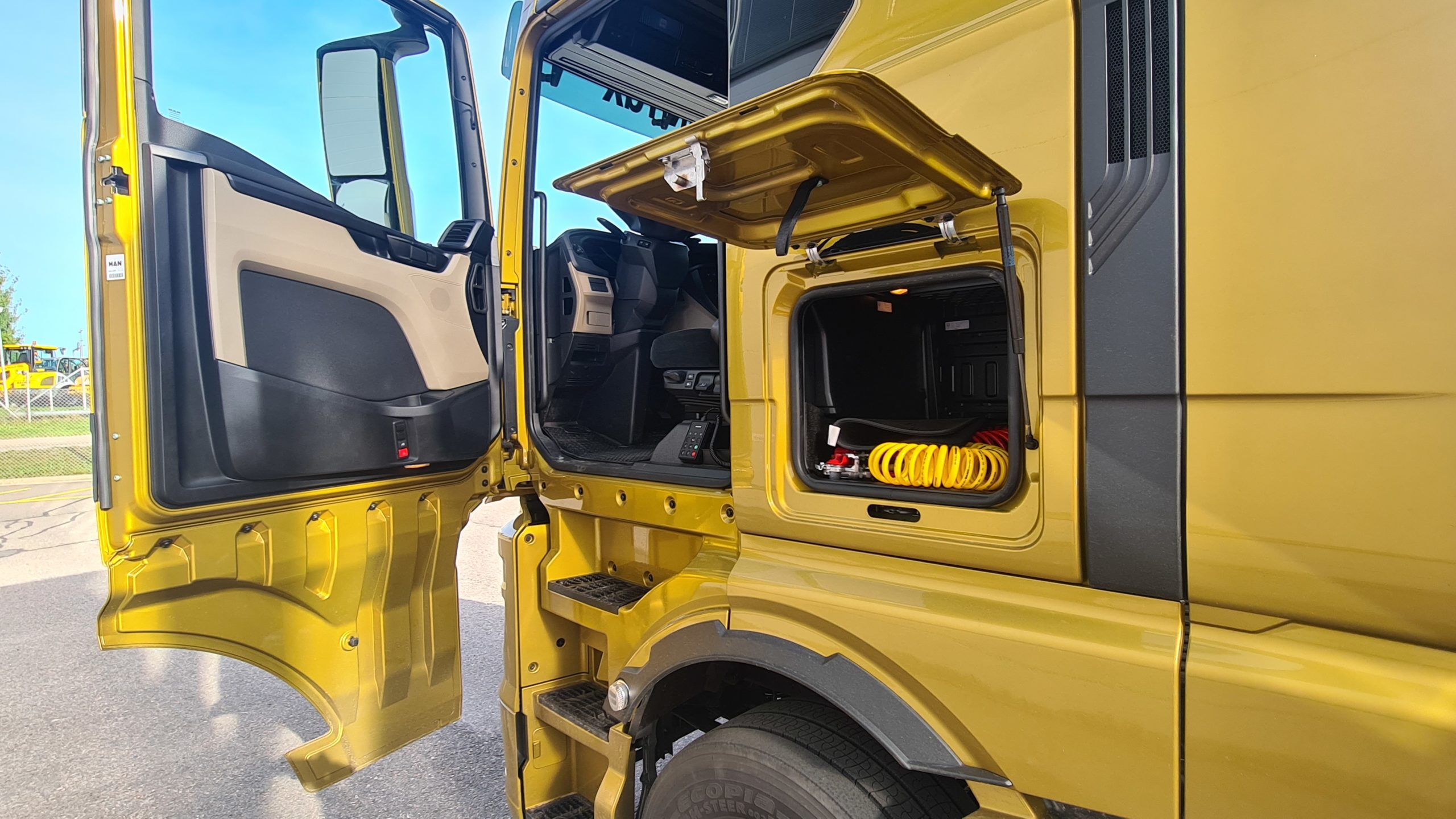 Alavuoteen alla on erilaisia säilytystiloja, joihin pääsee käsiksi nostamalla vuode ylös. Ohjaamon takakulmien tavaratilaan pääsee sekä ulkoa että sisältä, joten reissukassin voi nostaa sivuluukusta tavaratilaan ja vuoteen alta sisätiloihin. Hyvä ominaisuus ahtailla lauttojen autokansilla, ja muutenkin, sillä korkeaan ohjaamoon kiipeäminen on helpompaa ilman kantamuksia.