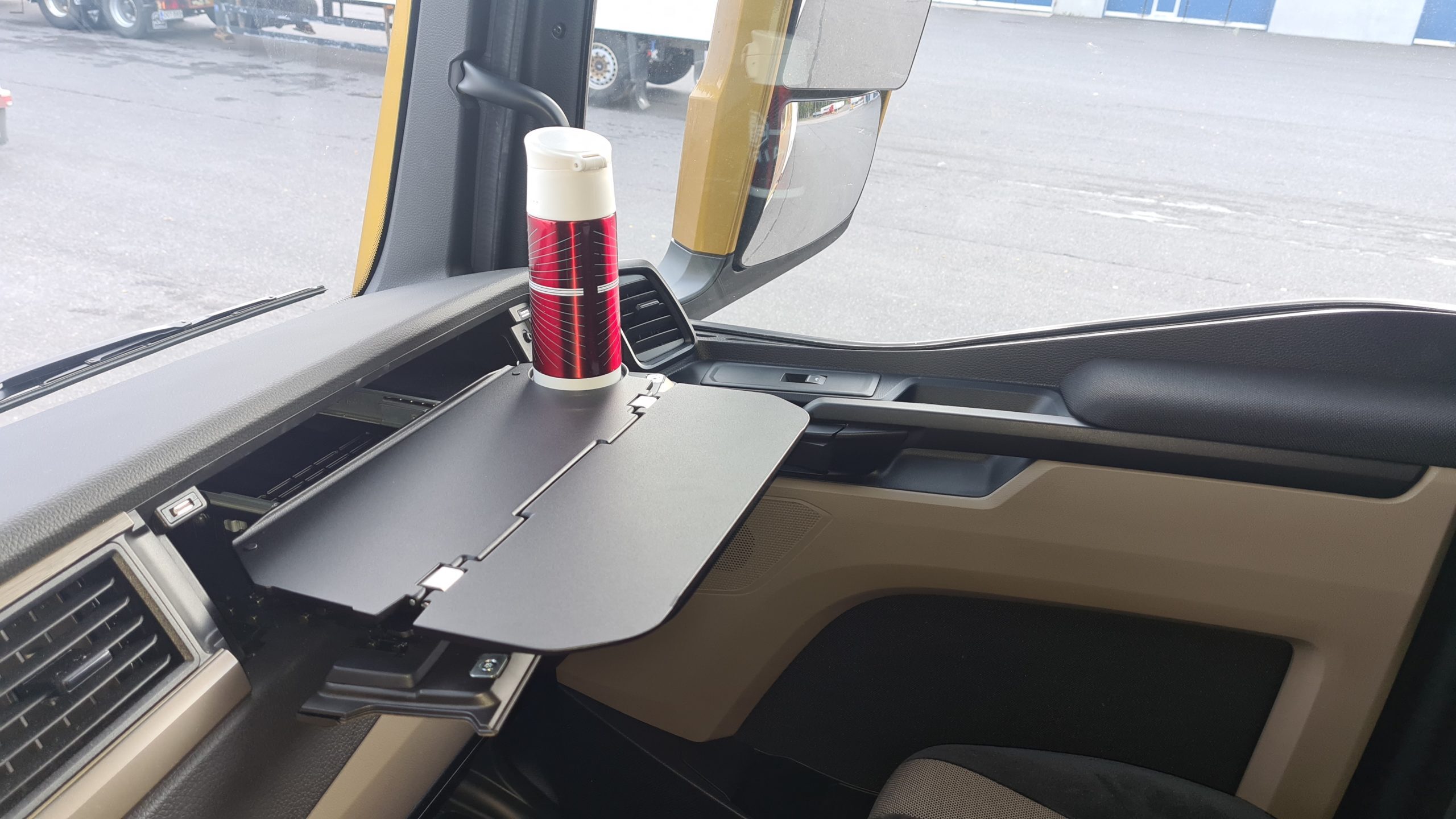 Vuoteen alle saa myös jääkaapin, joka on mitoitettu niin, että 1,5 litran juomapullo sopii pystyyn. Sen takia alavuoden on reunalla istumista ajatelle hieman turhan korkealla. Mukavampi on istua apukuljettajan istuimella, jonka eteen saa kojetaulun kätköstä loihdittua asiallisen pöytätason.