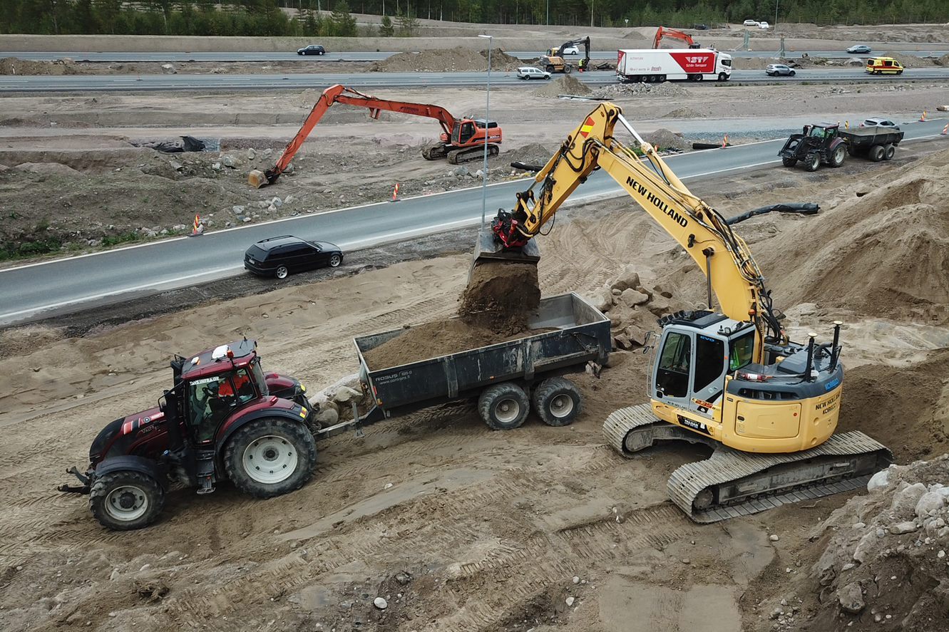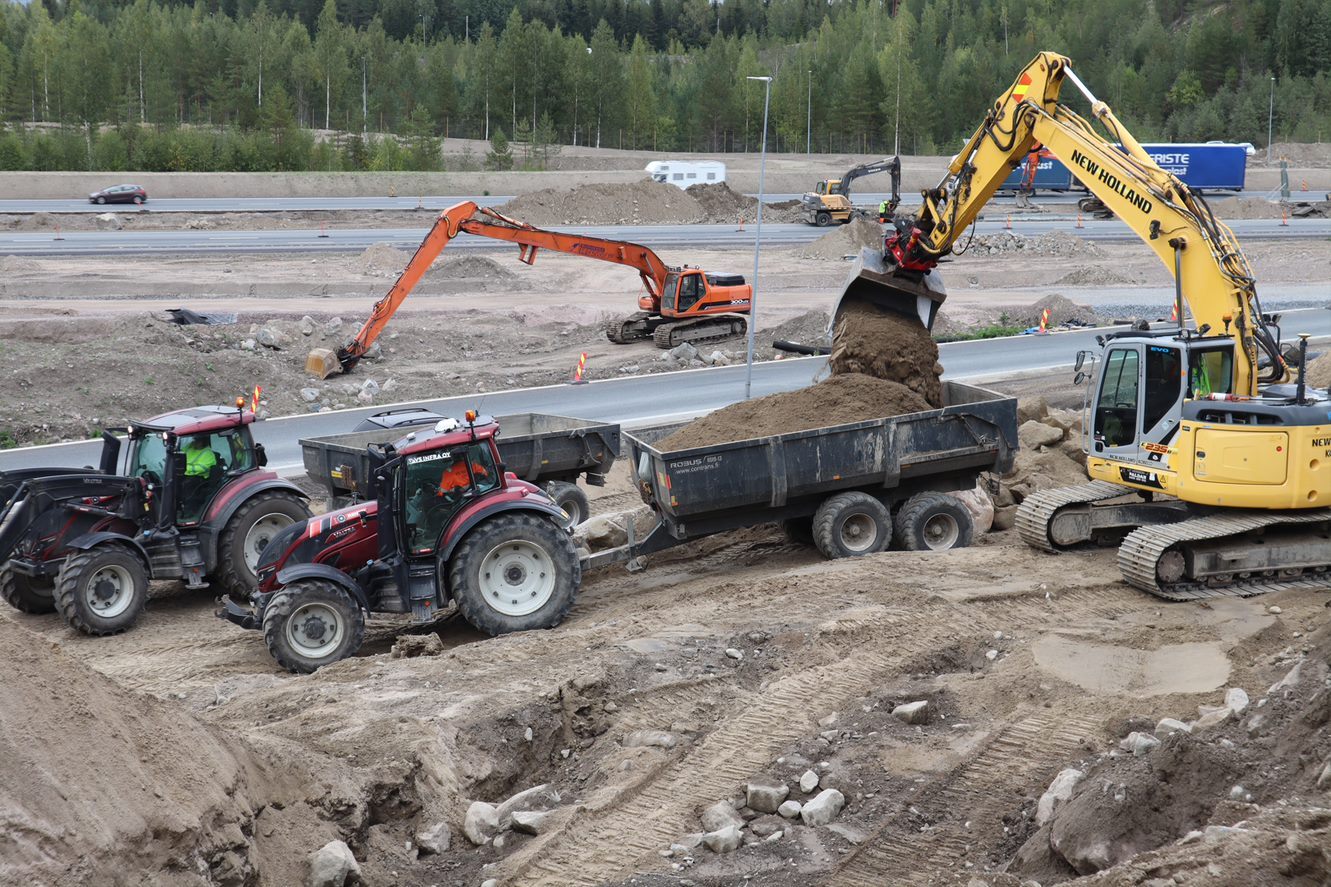 Traktoreilla siirrettiin aluksi pintamaat läjitysalueelle, josta ne ajetaan vielä projektin loppuvaiheessa takaisin pintamaiksi. Sen jälkeen jatkuvaa massojen ajoa on riittänyt usealle traktorille. Valmista täällä pitäisi olla parin kuukauden sisällä.