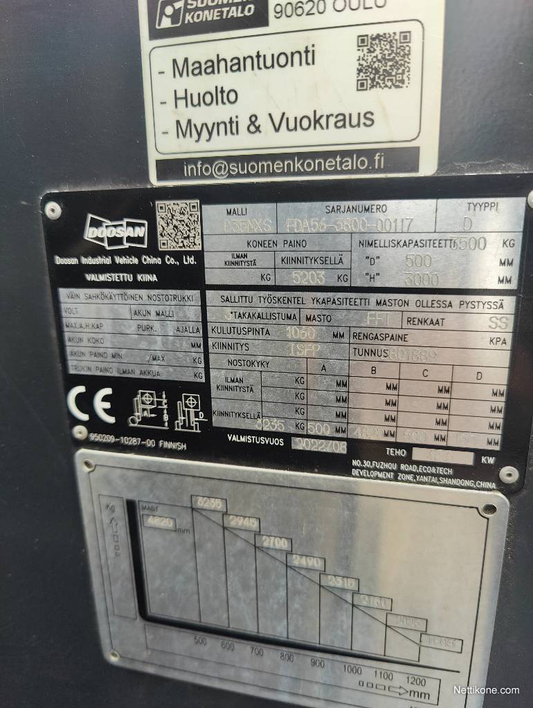 Teho: 46 Kw / 62 Hv, Kytkentätapa: Ei ilmoitettu, Alustanumero: FDA56380000117, Nostokyky: 3 500 kg, Nostokorkeus: 4 820 mm, Ajokorkeus: 2 350 mm