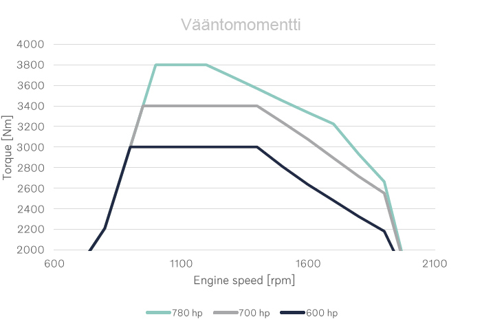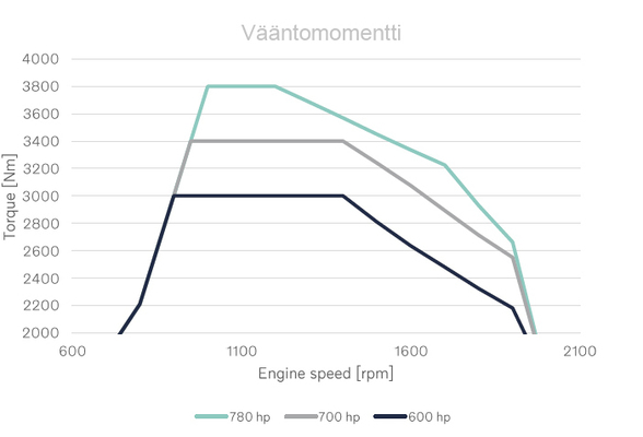 Tehovaihtoehtoja on kolme; 600, 700 ja 780 hevosvoimaa, kilowatteina 441, 515 ja 574. Moottorijarrun teho on parhaimmillaan 525 kW. Suurimmat vääntömomenttilukemat ovat vastaavasti 3 000, 3 400 ja 3 800 newtonmetriä. Kaikissa tehoversioissa vääntömomentti on käytettävissä kahta pienintä vaihdetta lukuun ottamatta kaikilla vaihteilla. Uusi ATO3812-vaihteisto välittää voimakkaimmankin D17-version vääntömomentin voimansiirrossa eteenpäin.