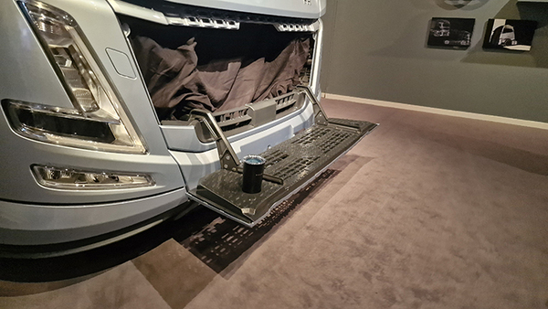 FH Aero on helppo tunnistaa edestäpäin, sillä aiempaa suurikokoisempi Volvo-rautamerkki on nyt ajovalojen välissä olevassa, mukitelineillä varustetussa ja istuintasoksi avautuvassa säleikössä. Taso toimii myös astinlautana tuulilasin puhdistuksessa, mutta siihen tarkoitukseen se avautuu turhan alas. Normaaliohjaamon kahden askelman toteutus toimii paremmin.