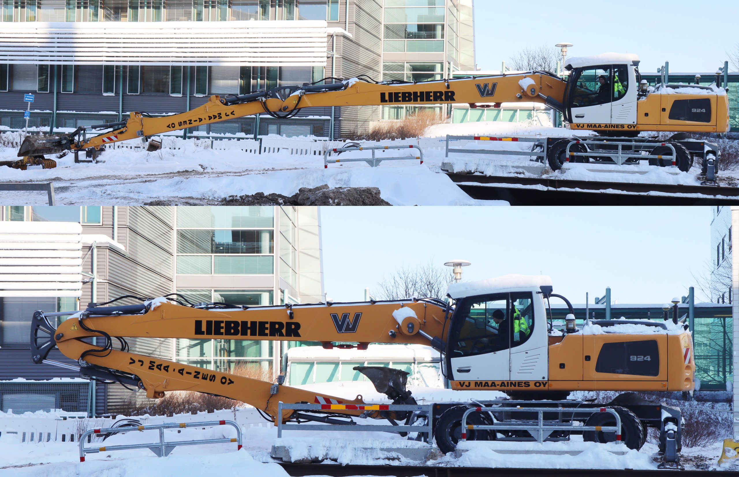 Liebherr 924 on varustettu tukijaloilla molemmissa päissä ja painaa kuvien varustuksella noin 30 tonnia. Kyseessä on tällä hetkellä VJ Maa-aineksen raskain kaivukone. Yrityksen yleisin ja kaupunkioloissa käyttökelpoisin konetyyppi on 19 tonnin lyhytperäinen varustettuna taittopuomilla ja 3D-laitteilla. Liebherreitä on kalustossa kaksi nyt hankitun pitkäpuomikoneen lisäksi (913 ja 914). Myös muita alan valtamerkkejä löytyy. Kaikkiaan kaivavaa kalustoa on yhteensä parisenkymmentä. Eri projekteissa työllistetään tilanteen mukaan paljon myös aliurakoitsijoita.