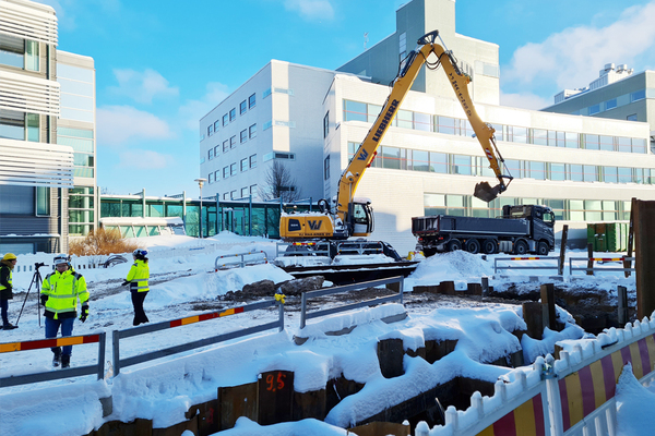 Varsin ahtaassa välissä Viikin kampuksen kohdalla oli valmisteltu paalutuskenttää ja kuvaushetkellä kuormattiin autoihin savea varsin syvästä kaivannosta. Normipuomisia koneita olisi tarvittu samaan työhön kaksi. Nyt kauhallisten nosto varsin etäältä ja syvältä onnistuu suoraan auton lavalle. Kone ei nyöki.