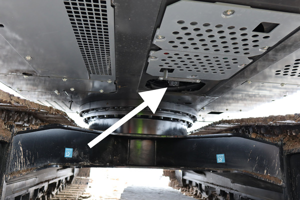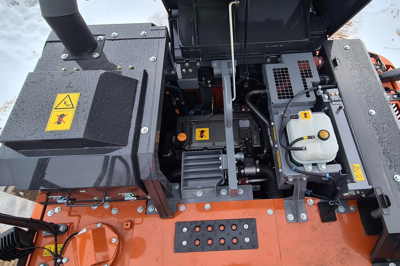 Koneen huoltoa helpottaa sen oikean takakulman luukun taakse kerätyt suodattimet. Huoltotyö sujuu näin tukevasti maassa seisten. Koneessa on nyt myös moottori- ja hydrauliikkaöljyn kuntoa tarkkailevat anturit, jotka epäpuhtauksia tai muita öljyn ominaisuuksia laskevia tekijöitä havaittuaan lähettävät viestin myös valmistajalle.
