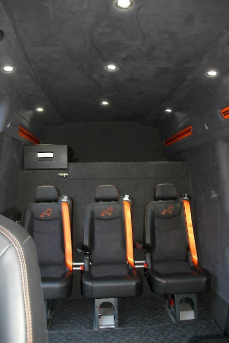 Kaksipaikkainen ohjaamo on avara ja istuimet ovat erittäin tyylikkäästi verhoiltuja. Kaikki hallintalaitteet ovat totutun helppokäyttöisiä ja perusautoon eroa tuovat vain matkustamon valaistuksen hallintapaneeli sekä sähkökäyttöisen sivuoven käyttökytkin. Matkustamossa huomio kiinnittyy upeaan verhoiluun ja eleganttiin värimaailmaan. Matkustamon takarivissä on kolme istuinta ja etuosassa kaksi, joissa istutaan selkä menosuuntaan. Osanahkaverhoillut Carsport-erikoisistuimet MAN-logoilla ovat mukavuudeltaan ja säädettävyydeltään huippuluokkaa, joten matkustajien viihtyvyys on taattu pidemmilläkin matkoilla.