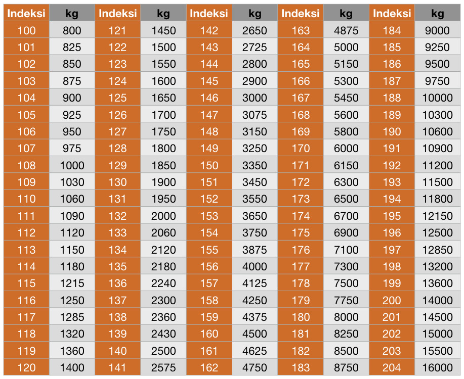 Kantavuusindeksi kertoo paljonko rengas kantaa painoa 2,4 barin paineella ja kyseisen nopeusluokan sallimalla nopeudella. Pienemmällä nopeudella renkaan kantavuus on vielä suurempi. Esimerkiksi kantavuusindeksi 150 tarkoittaa 3350 kiloa ja kantavuusindeksi 170 tarkoittaa 6000 kiloa.